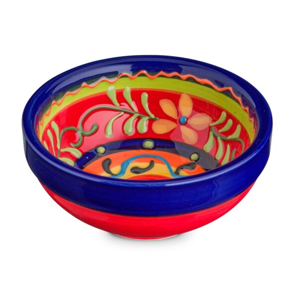 Schitterende Spaans hand geschilderde keramiek rond tapas schaaltje van 7 cm. Het aardewerk dat is gebruikt voor dit schaaltje is uniek voor Andalusië. Deze wordt eerst één keer gebakken, vervolgens met de hand beschilderd en geglazuurd en vervolgens nog een keer gebakken op een temperatuur van 950 graden. Dit is net wat warmer dan het meeste gebakken aardewerk waardoor het aan sterkte wint.